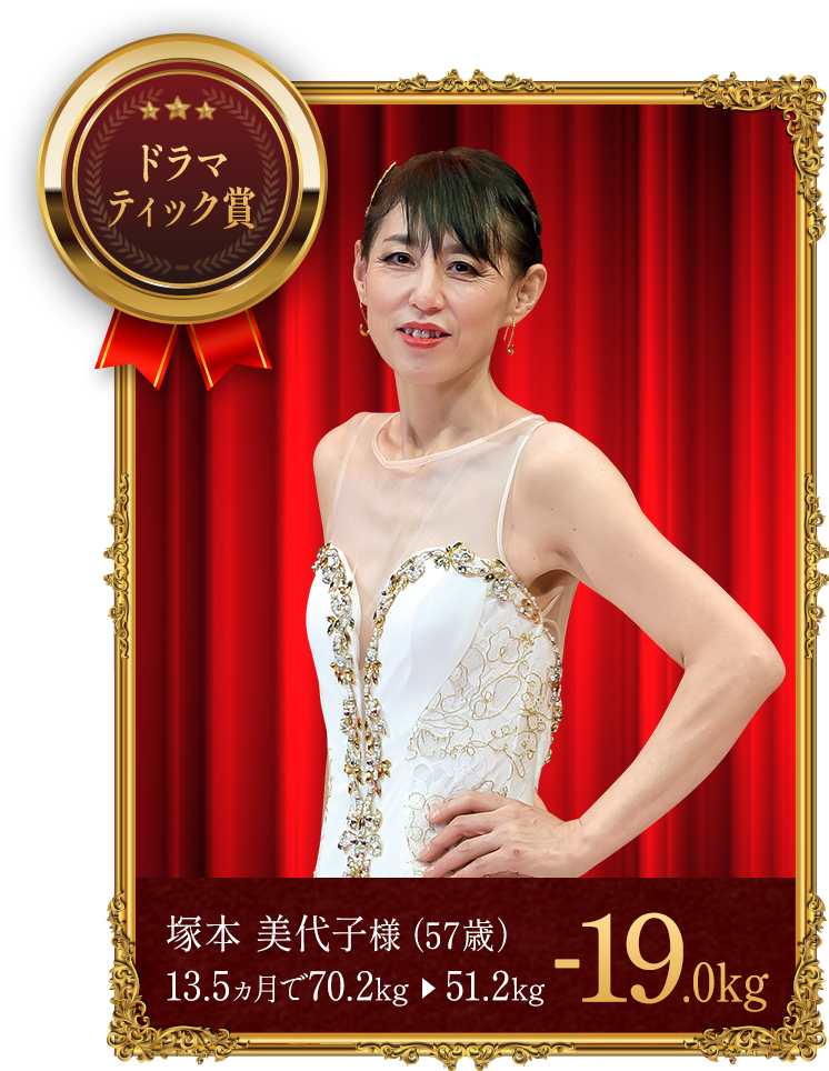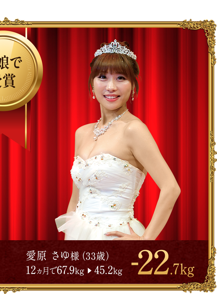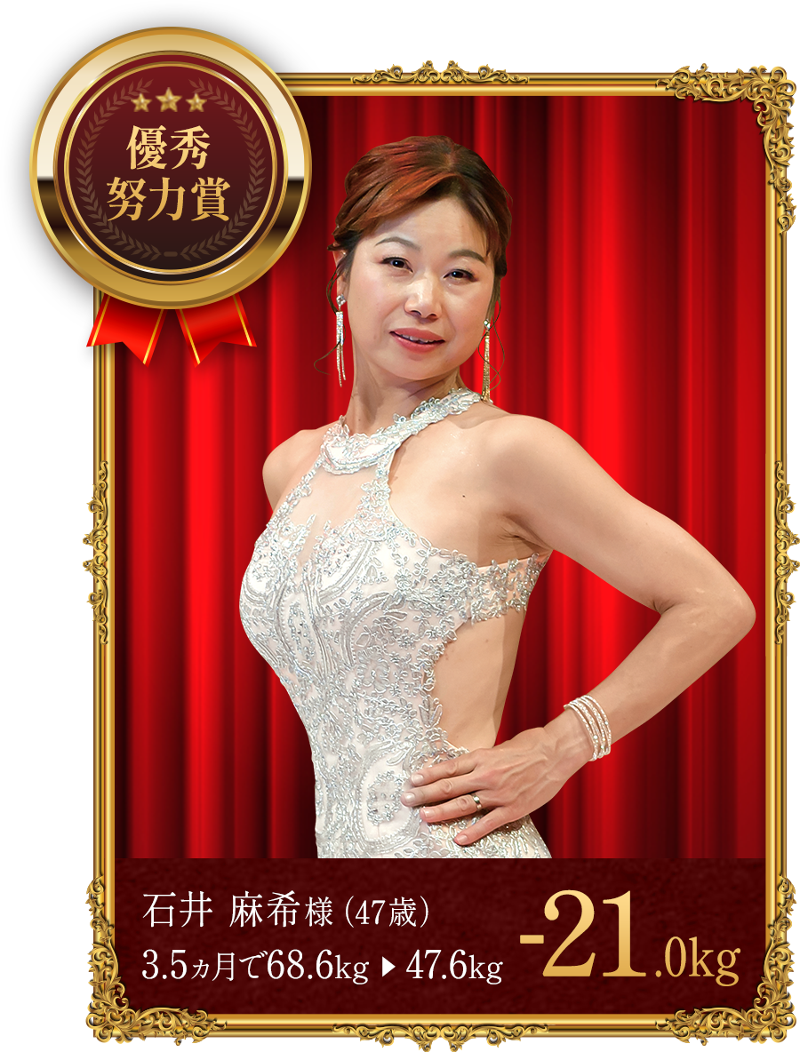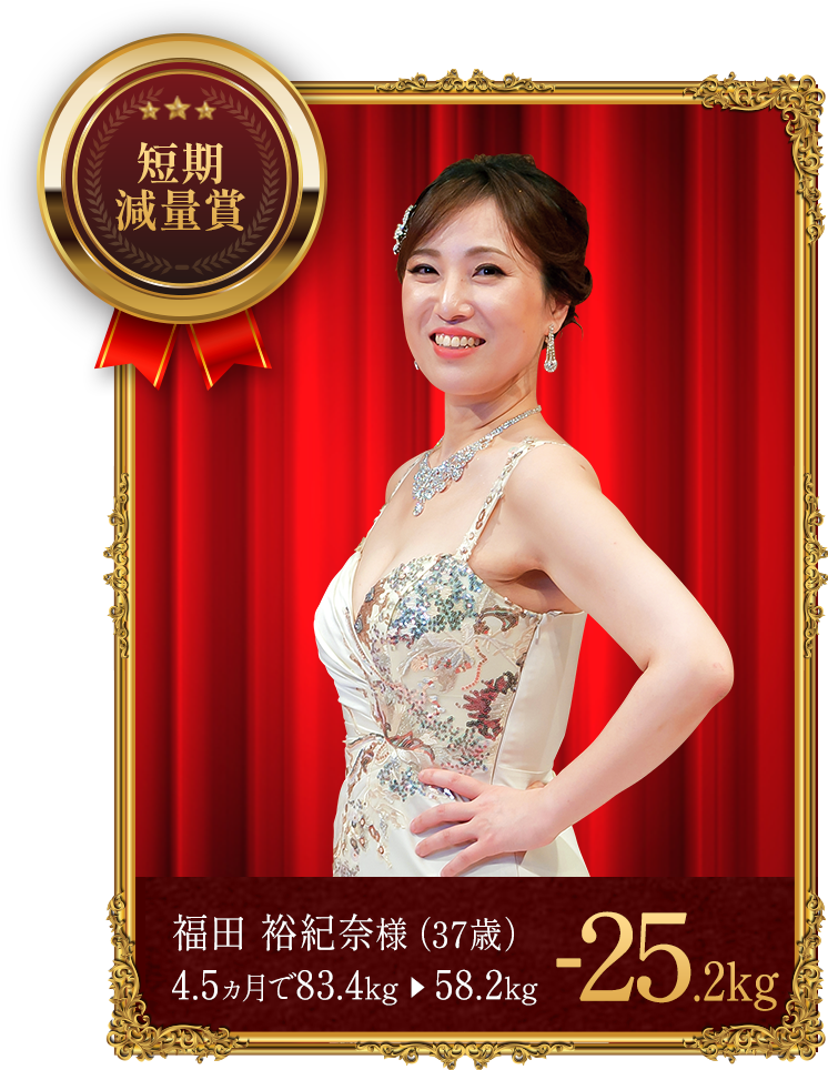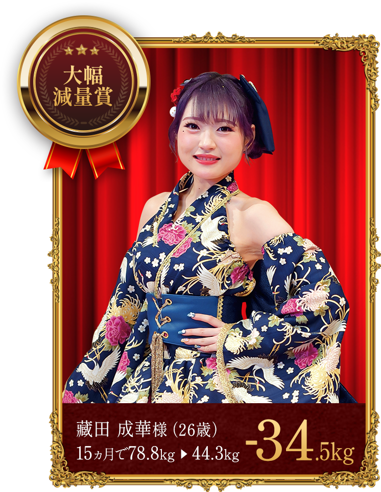 - ※上記の受賞者は本格痩身コースでボディケアを受けながら、食生活の改善や運動、ホームケアのアドバイスを実行した結果、上記の減量値を達成しました。