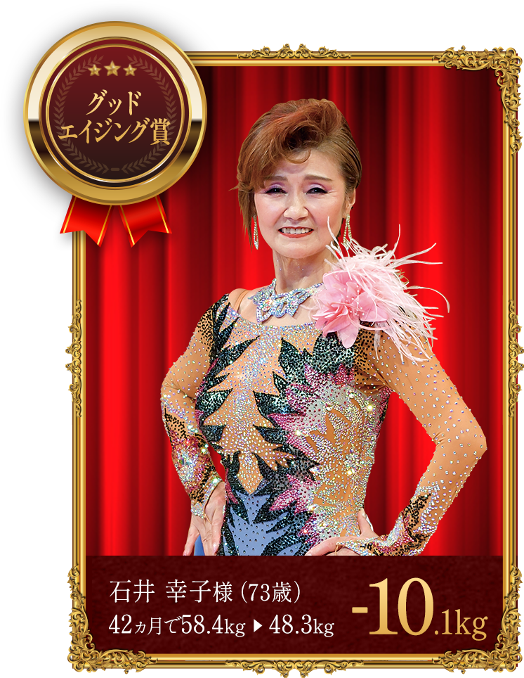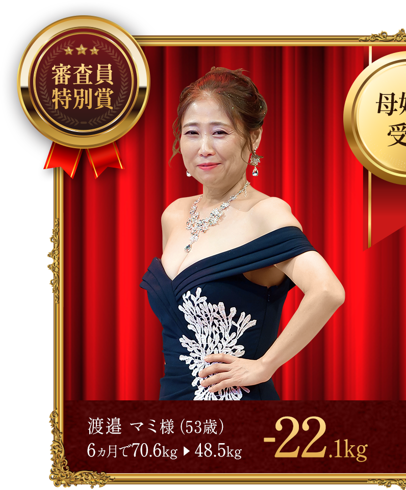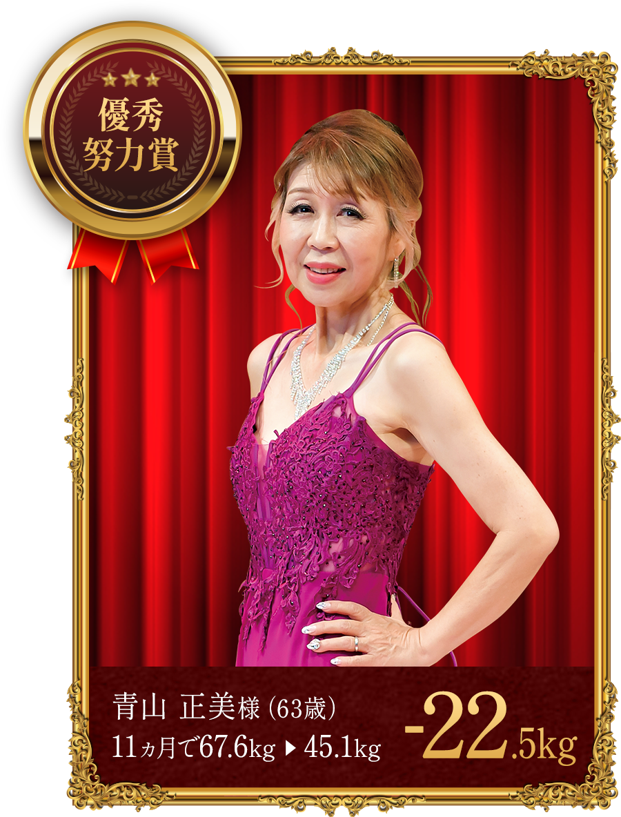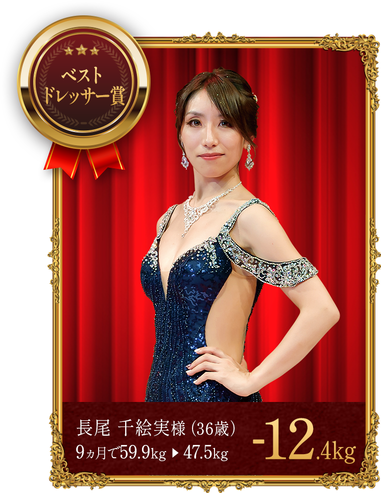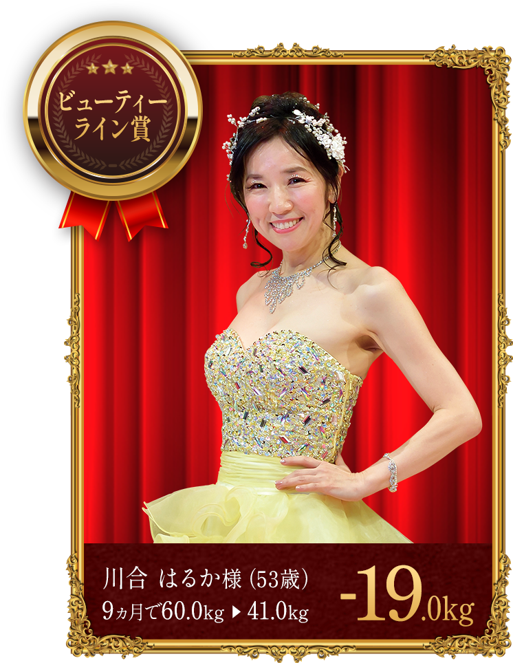- ※上記の受賞者は本格痩身コースでボディケアを受けながら、食生活の改善や運動、ホームケアのアドバイスを実行した結果、上記の減量値を達成しました。
