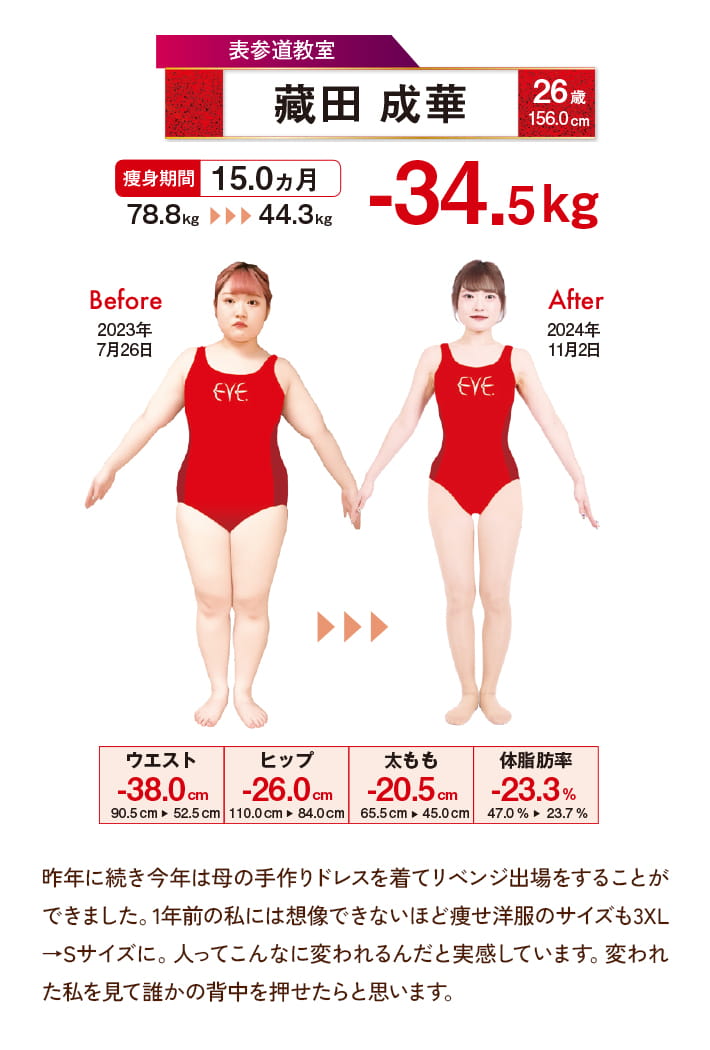 この日のために、全国22教室、総勢200名の生徒様が痩身に励み、その努力と情熱は圧巻のステージを作り上げ、観る者に感動と挑戦することへの勇気を与えました。