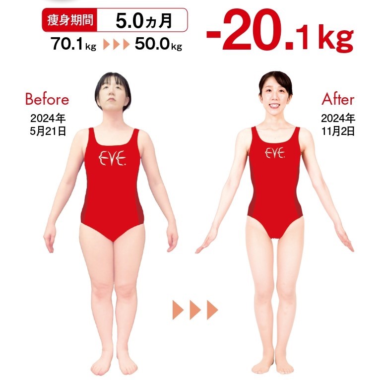 EVEに通い始めて1ヶ月で約6.5㎏体重が減り、3ヶ月で約14㎏の減量を達成。停滞期もあり、無理な食事制限をしてしまったりしたこともありましたが、スタッフの皆さんに食べないと痩せないと教えてもらい、トリートメント以外での食事の摂り方やホームケア方法などを細かくアドバイスしてもらったことが20㎏以上の減量に結びついたのだと思います。痩せた今、ずっとやりたいと思っていたことに挑戦しようと勉強中です。痩せて気持ちが前向きになりました!