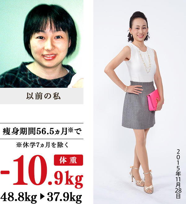 子ども2人を出産後、職場へ復帰、その後、人生最大の体重&体脂肪率に…。ふとショーウィンドウに映った自分の姿にあぜんとし、このままではダメだと思い、イヴを訪ねました。暑いトリートメント室で体がスッキリする手技を受け、家では先生たちのアドバイスで、野菜、納豆を取り入れたバランスのよい食事を心がけました。最初の9回で5kg減!7kg痩せたときのアメリカ旅行では結婚後、初めてビキニを着ました。減量とともに健康になり、周囲の人からの「キレイになった」の声は、内面から輝くビタミン剤に。何をするにも健康第一です。イヴに出会えて本当によかった。健康な体で仕事を続けていける毎日に感謝しています。