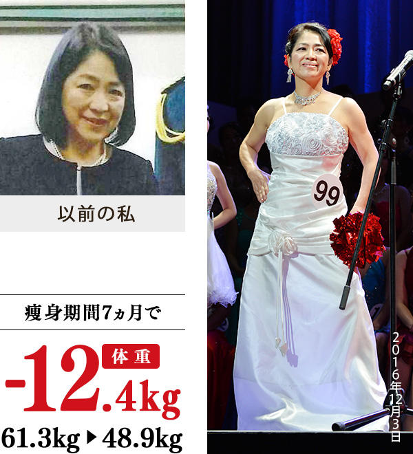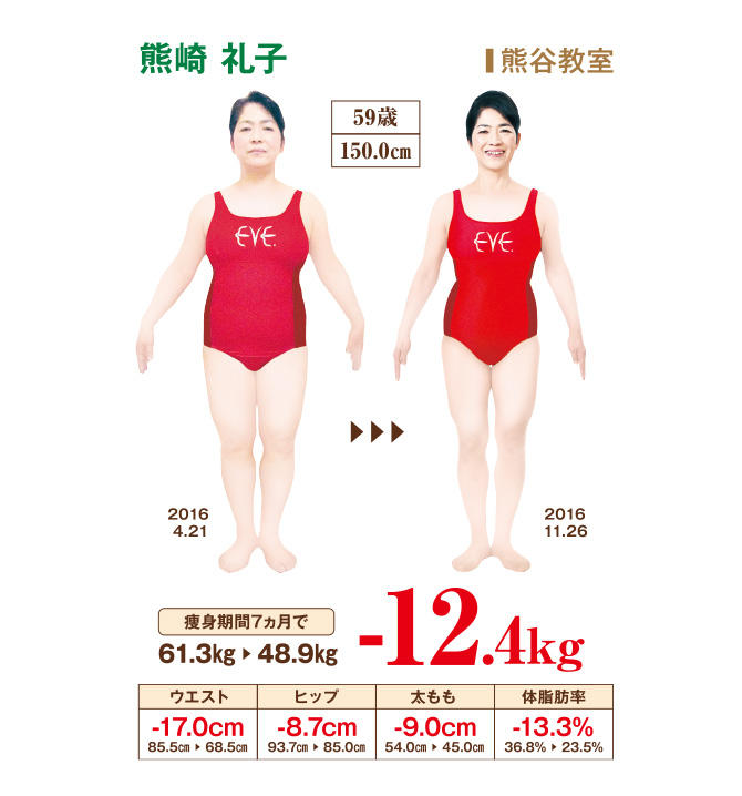 次男の結婚式までに痩せたいと思っていたときに、イヴの広告が入ってきたため、次男が私の誕生日に体験プランの費用をプレゼントしてくれました。暑さが大嫌いなので、最初は教室の高めの室温が苦手でしたが、汗をいっぱいかきながら痩身技術を受けたことで、お腹の脂肪は柔らかく、脚も細くなっていくのを実感。自宅では、食事指導でクコの実を料理に活用し、水分は常温の飲み物を少しずつ摂取するようになりました。しかも、ホームケアでイヴ伝授のブラッシング体操を行った日は、必ず体重がダウン!体のゆがみがまっすぐになったり、O脚が直ったのは骨盤手技、たるみなく痩せることができたのは健康補助食品のおかげだと思っています。