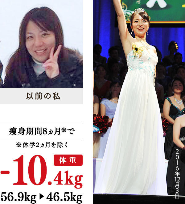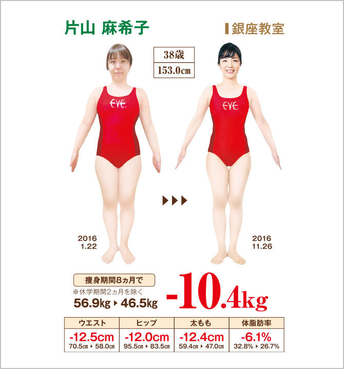 30代半ばから、体重を日々更新。いろいろなダイエットを試したり、ジムにも通い、3kgくらい痩せても、やめると元通りに…。子どもに、「みっともない体」「スカートを履かないで」といわれていたので、友だちがすごくキレイに痩せたイヴに、私も入学しました。オープンフロアの教室で、すでに痩せた生徒さんたちの姿を見ると、自分も頑張ろうという励みになり、痩身技術を受ければ毎回確実に体重がダウン。自宅では、先生たちのアドバイスで、朝しっかり、夜は少なめに食生活を改善し、ホームケアのブラッシング体操を起床時や半身浴前に実行したら、小学生時代の体重に戻りました。子どもにも、「痩せた!」と喜ばれる日々。とても感謝しています。