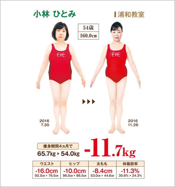独身時代より15kg体重が増えた45歳以降、体調が悪化し、子宮全摘、乳がん…と病気の連続でした。健康診断では、「このままでは高血圧や糖尿病になる」との忠告。そんなとき、埼玉県に住んでいる40年来の友人が、広島に帰郷するたびに、「本気で痩せたいなら、私が1年以上通い、確信したイヴしかない!」というので体験してみました。すると、汗がとまらず、体はすっきり爽快で、体重も1kgダウン。週末の休日前後は会社に休みをもらい、広島から埼玉へ来て、友人宅に泊まりながら、集中ケアを始めることにしました。最初の通学7回で−5kg、さらに痩せ、20代の体重が復活。過去に同業勤務の経験がありますが、イヴでエステの概念が変わりました。