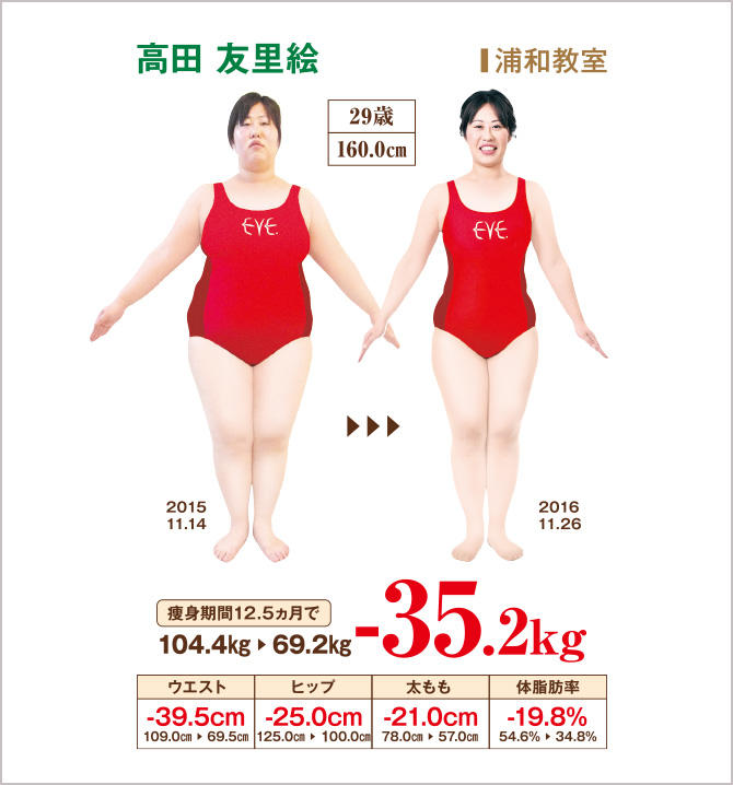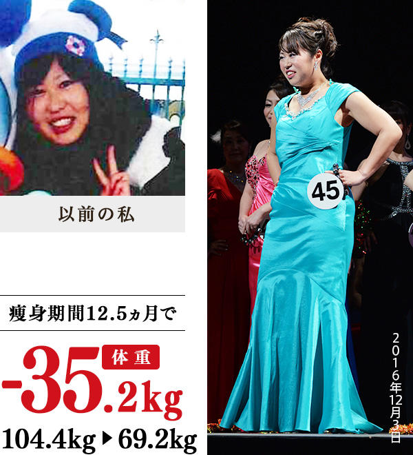 19歳頃から太り始め、さまざまなダイエットに挑戦しましたが、長続きせず、失敗ばかり…。人生最大104kgのときに、母に連れられてイヴへ行きました。最初の頃は、教室の暑さにすぐにのぼせていましたが、慣れたら平気になり、痩身技術を受ければ、数時間で体重が減ることにビックリ!自宅では、私にあった食事やホームケアアドバイスを実行し、大学時代の体重に戻りました。健康診断では、1年前に比べてほとんどの数値がよくなっていて、健康やせを実感。今までは数時間しか滞在できなかった趣味のディズニーランドも、開園から閉園まで園内を歩き回って充実した1日を過ごせるようになりました。イヴは私の人生を変えてくれた教室。感謝しています。