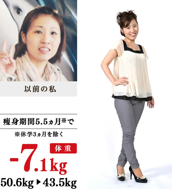 高校卒業後から太り始めました。社会人になってからも仕事のストレスで暴飲暴食をして体重が増え、そんな悪循環がストレスになるという日々…。イヴのオープンスペースの教室の雰囲気には、慣れることができるか不安でしたが、体験してみたらそれが逆に楽しく、入学を決めました。その日の体調にあわせて痩身内容を決めていただけたので、無理なく通うことができ、先生たちの丁寧な手技では、体のラインが確実に変化!前向きで優しい先生たちに、毎回癒されてもいました。アドバイスを参考に、疲労回復とむくみをとることを目的に半身浴をすると、翌朝も体が軽く!夜勤のときは、いつもよりも食事のバランスに気をつけるようにしました。今では、靴下を履かなければ眠れないほどだった冷えも軽減され、中学生時代の体重に戻ることができました。イヴの食べながら痩せる方法は、1番健康的なことだと実感しました。