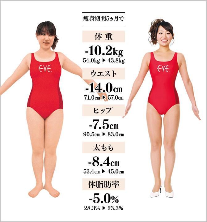 子どもの頃からポッチャリ体型。運動や自己流痩身をしても、常に太かった太ももと、手を振れば肉が揺れた二の腕は細くなりませんでした。旅行先でマリンスポーツをするときに、ビキニが着られなかったので、初エステのイヴへ。先生方は元気で親しみやすく、施術を受けながら、汗を出すことの大切さを知り、体中のコリがほぐれたり、見た目がスッキリすることも実感。家では、朝に果物を食べ、肉より魚を多くし、水分のとり過ぎに気をつけ、半身浴とブラッシング体操も実行。コンプレックスだった太ももや二の腕が細くなり、お腹周りにはくびれもできました。体型に自信がもてるようになったので、ビキニを買いました。