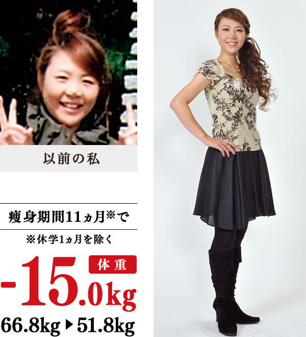 椎間板ヘルニアが悪化し、歩くことも、座ることも、仕事もできなくなり、病院で、「手術しかない」といわれましたが、手術が嫌で、減量しようと思いました。イヴでは、体調にあわせて施術を進めていただけ、少しずつ腰への負担が軽減。家では、野菜を多く食べるように心がけ、水分のとり過ぎにも気をつけ、ブラッシング体操は、腰に負担をかけない程度に実行。痩せたら、普通に仕事ができるようになり、手術も不要に。職場の方もとても喜んでくれました。洋服は、15号のカジュアル系から9号のワンピースなどに変わり、ミニスカートやビキニにも挑戦してみたいです。