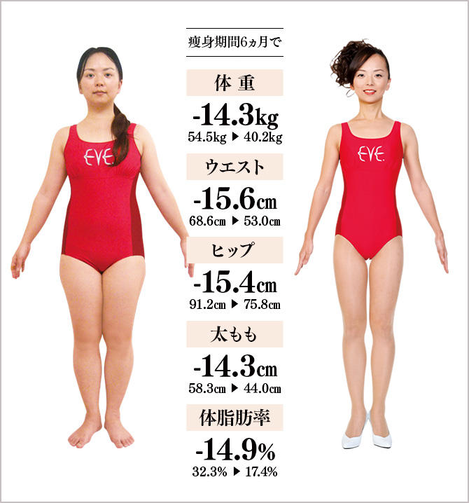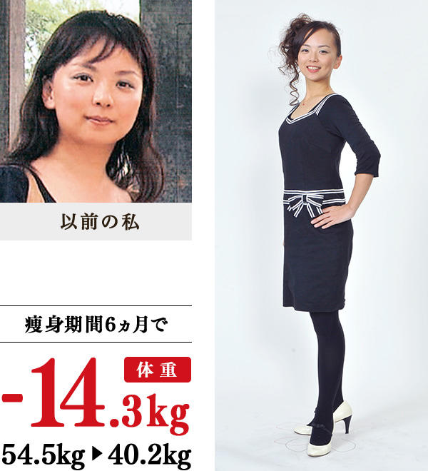 6年前に43kgだった体重が、遅い時間帯に食べる高カロリーの夕食と妊娠で10kg以上増加。その後、流産という深い悲しみを経験し、あとには脂肪だけが残ってしまいました。冷えと肥満を解消して、次の妊娠に備えようと思い、イヴに入学することに決めました。イヴで、集中的に体を芯から温めるという初めての体験をし、減量には体脂肪を燃やすことが不可欠だと実感。食事もホームケアも充実の指導で、いつの間にか10kg以上痩せていて、疲れにくく、むくみにくくなり、肌までツヤツヤに。女性として、健康でキレイな姿を取り戻しました。