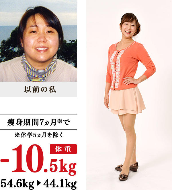 ストレスからうつ病になり、薬の副作用プラス、動かない日々が2年間続き、肥満になりました。大好きなお洒落が楽しめずに、悲しく、水着を着たくないから海へは行かない、旅行へ行っても写真を撮らないから思い出が減るという、辛い毎日…。そんなときに、広告でイヴを知りました。一緒に頑張り、喜び、応援してくださる先生方の指導で、10.5kgの減量に成功し、20代の頃の体重に!洋服は、13号から7号に3サイズもダウン。1番気になっていたウエストがくびれたので、ラインの出る服やスキニー、ミニスカートを着るようになり、流行の細身の柄パンツデビューもしました。気持ちが明るくなり、お洒落やショッピングも楽しい日々。旅行で水着になる計画も立てています。