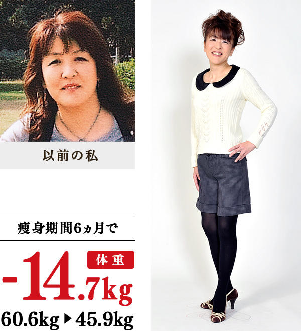 仕事がとても忙しく、運動をせず、ほとんど車で移動の生活。不規則な生活と、暇さえあれば何かを食べる日々で、40代前半から太る一方に…。13号のマタニティーのようなゆったりした洋服を着ていたせいもありますが、妊婦さんに間違えられ、電車で席を譲られたこともあります。人生初痩身で、最初は不安でしたが、イヴで施術を受けると、脚のむくみが取れたり、翌日の目覚めがすっきり!家では、食事を夜9時までの決まった時間にとり、海草類を多く食べるように心がけました。今では、お腹を隠さない9号の洋服がOKに。コレステロールが理想値になり、乾燥肌もよくなりました。