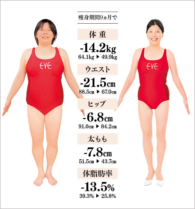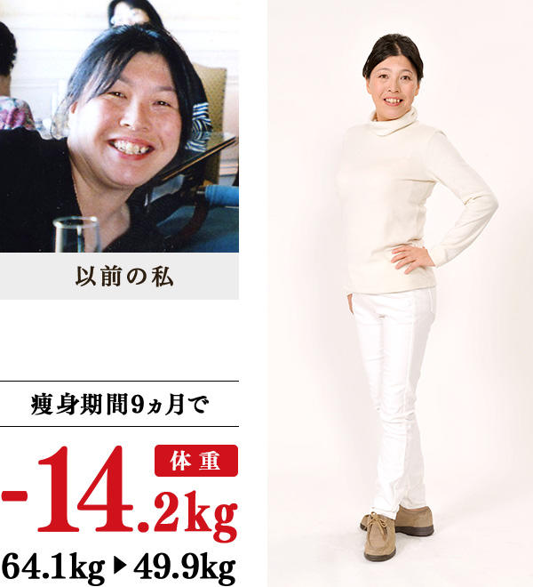 人生初のインフルエンザ感染、父の突然死、血液検査では全てにひっかかり、体重は最大級…。体ボロボロのときに、「健康やせ」の言葉に惹かれ、「心身共に健康になりたい」と思い、予約なしでイヴに来店しました。心の健康もよく考えてくださり、プライベートな話にも耳を傾けてくれる先生たちにサポートされながら通学。施術を受けると1回の減量数が多く、最終的に14.2kgの減量に成功し、10年前の体重に!洋服のサイズは、15号から9号へ3サイズもダウンし、ミニスカートやデコルテを出す服をよく着るようになりました。職場の人に、「くびれができた」といわれたのも嬉しかったです。自分に自信が持てるようになったので、夢だった写真集をつくろうと思っています。