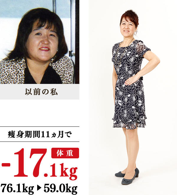 子どもの頃から太めで、人からいつも、「大きいね」といわれ、傷ついていました。生まれつきだからと諦めていましたが、50年間生きてきて、1回でもいいから、「スマートね」といわれてみたいと強く思い、この大きな体ときちんと向き合ってみようと、イヴの門を叩きました。初エステのイヴでは、17.1kgの減量に成功し、25年前の結婚当時の体重に!洋服は、17号から11号に3サイズもダウンし、ウエストラインが出る服が着られるようになりました。知り合いから、「体のラインがキレイになった!」、母から、「ひとまわり体が小さくなった!」といわれたのも嬉しかったです。毎日、気分もウキウキ。おけいごとにチャレンジしたくなり、英会話も前向きに通おうかと思っています。