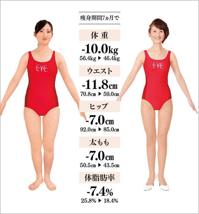 高校時代に海外留学で10kg太って以来、自己流痩身とリバウンドの繰り返し…。20代後半から自己流では痩せなくなったため、イヴに入学しました。最初は半信半疑でしたが、オープンフロアの教室で他の生徒さんの痩身成功例を実際に見ているうちに、「結果は確実に出る!」と思えるようになり、家でも、食事指導や半身浴、ブラッシング体操を実践したら、減量に成功!無理だと思っていた二の腕も、約10cmも細くなりました。全身バランスよく痩せ、美ラインになり、5号の洋服も着られるように。肌もニキビができにくくなり、透明感と白さがアップ。体型だけでなく、肌もキレイになって、幸せです。