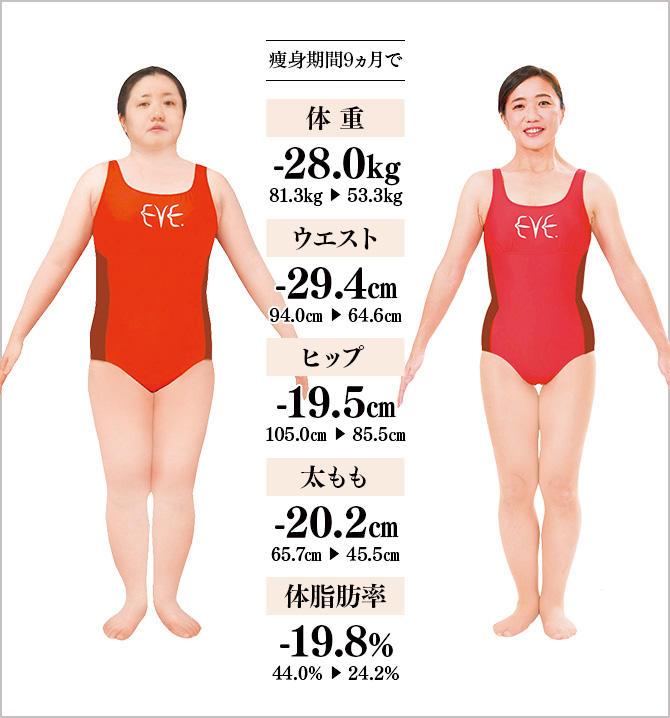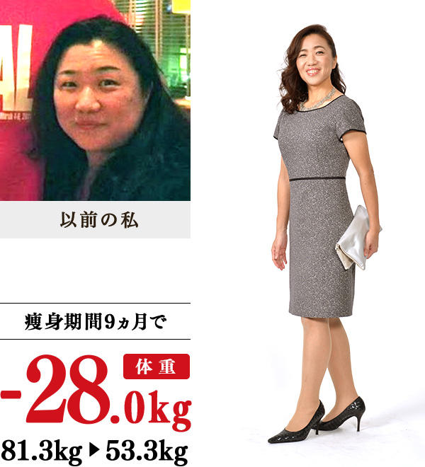 20代前半までは理想的な体型。転職後、生活が一転したとたん、体重が増え続け、83kgにまでなってしまいました。ある日献血に行ったら、健康数値が高く断られ、医師に「痩せたほうがよい」と何度もいわれ、ショック…。本気モードで痩せることにしました。イヴは、個室でないこと、先生たちがとても明るく話しやすく、他の生徒さんとおしゃべりができることなど、今まで通った他のエステとは違い、驚きの連続!理にかなった痩身技術を説明しながらやってくださるので、納得して受けられました。みんなで頑張ろうという雰囲気なので、孤独で辛い思いをすることなく、本気で痩せたい人にはピッタリだと思いました。食事指導も、「禁止」ではなく、「できる範囲」でのアドバイスだったので取り入れやすく、通学6回で5kg減、19回で10kg減、さらに痩せ、今は献血ができる健康体に!28kgも痩せた私の変身ぶりを見た姉と妹も同じ教室に入学しました。