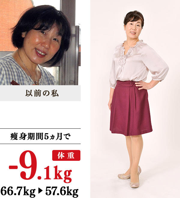 2012年に再婚。夫と知りあう前はそれほど太っていなかったのですが、2人で旅行に行き、各地の美味しいものを食べていたら、気づいたときには体重が10kgも増えていました。当時の勤務先では、看護師の白衣もパンパンに…。サイズを大きくするのが嫌なので、中高年の方も通っていて、「健康やせ」をモットーとしている噂のイヴを訪ねました。教室では、体重が減ると、先生方が自分のことのように一緒に喜んでくださるのを嬉しく感じながら、9.1kgの減量に成功!洋服のサイズは、13号から9号に変わりました。ウエストがくびれたのでスカートも履けるように!独身の頃の体重に近づいたので、撮っていなかったウエディングドレス姿の写真を撮りたいです。