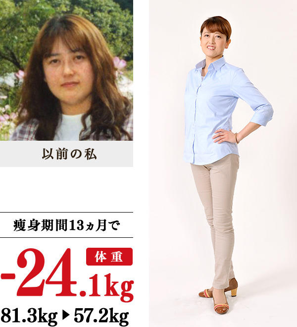 1年間で体重が激増し、それに伴い、少し動いただけで息切れがしたり、膝や腰にも負担がかかるようになりました。娘の保育園の友だちから、「太っている」といわれ、娘には慰められ、息子は諦めている様子…。今まで、体重を増やすことはできても、減らすことができなかったので、まずはイヴの体験を試してみました。1〜2回で体重が減ったのがわかり、体重を落とすと同時に引き締めたいと思い、入学することに。教室では、先生方がいつも一生懸命、施術を行ってくださる姿に感謝しながら、24.1kgの大幅減量に成功し、高校1年生頃の体重に!洋服のサイズは、15号から11号に変わり、体にフィットする服を着るようになりました。「私も痩せられるんだ!」という自信がつき、人の目も気にならなくなりました。