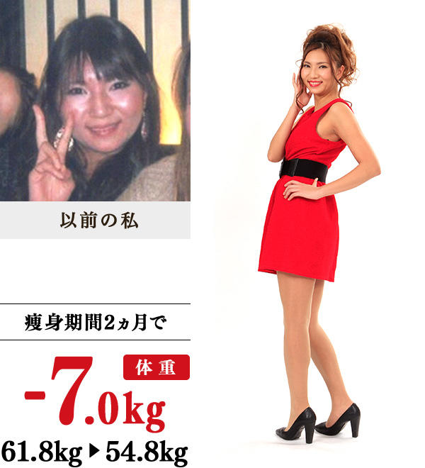 就職後、一人暮らしを始めてから、食べたいときに食べたい物を好きなだけ食べていたら、どんどん体重が増加。いろいろな自己流痩身を試したけれども3日坊主でやめてしまうか、痩せてもリバウンド…。ついに好きな洋服が着られなくなったのでイヴを訪ねました。通い始めると、先生たちは感じがよく、教室に痩身仲間もいるので頑張ろうという気持ちになれました。家では、朝食抜きをやめて、燃えやすい体にするためにご飯を食べ、何にでもしょうがを入れ、もずくや納豆も食べるなど、食生活を大改善。5kg痩せた頃からまわりの人に、「痩せたね」といわれるようになり、自分に自信が持てました。徐々に代謝が上がったのか汗をかきやすくなったので、温かい教室に通うことに意味があるのだと実感しました。