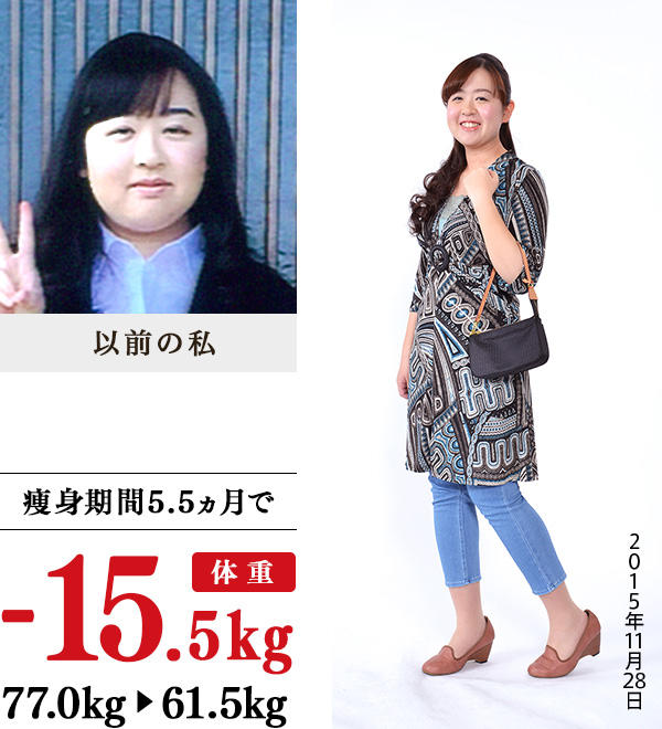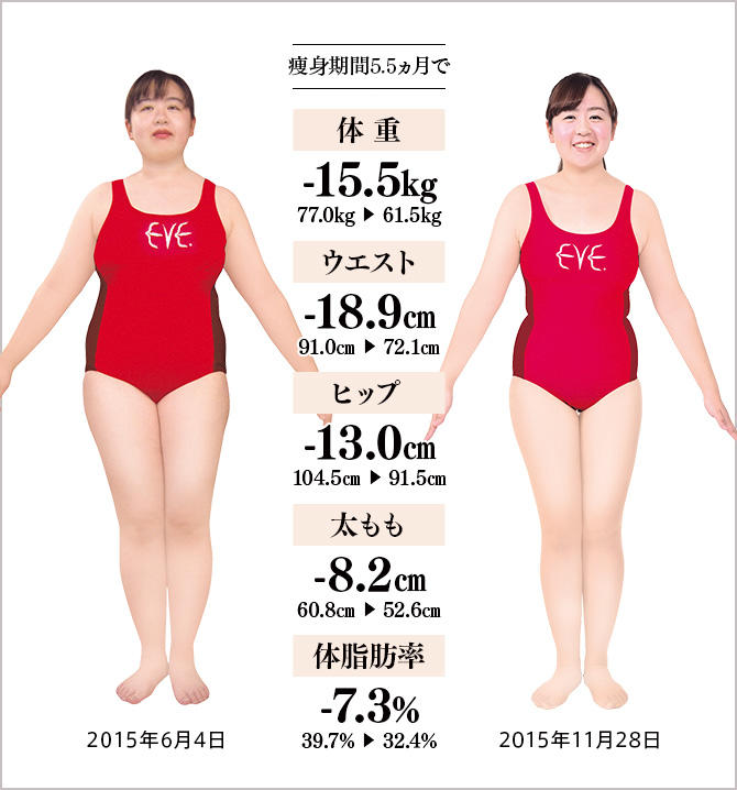 高校受験のときに、脳への糖分補給と甘い物のあとに塩辛い物を食べていたら、中学時代よりも体重が20kg増加。エクササイズDVDやマシンを購入したけれども、まったく続かず、大学入学時は80kg台。大学の保健センターの保健医さんからは、「このままでは確実に病気になるので、痩せなさい」の言葉…。そんなときに出会ったのがイヴでした。温かいトリートメント室で痩身技術を受けているうちに13歳頃から感じていた冷えが解消し、体の肉質も柔らかくなり、8回で5kg減、27回で10kg減!靴下が立ったまま履けるようになりました。イヴは、本気で痩せようと思った私を導いてくれた恩師のようです。