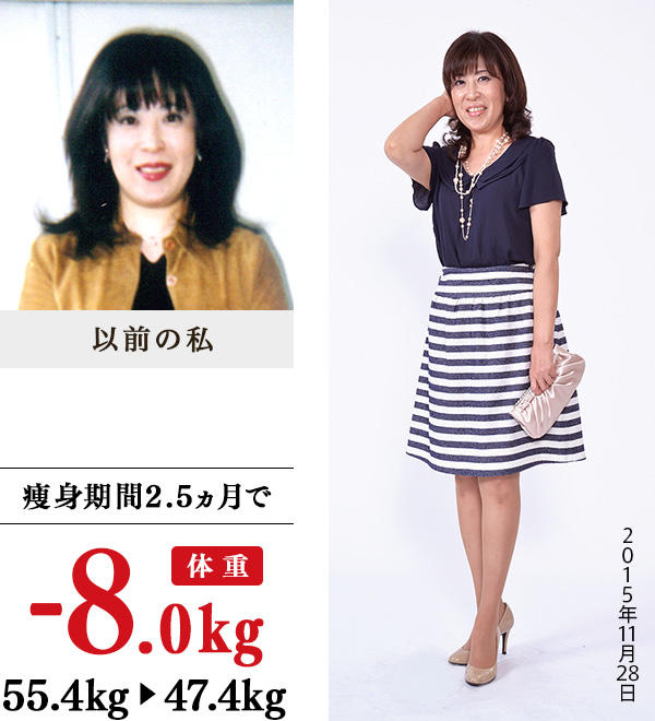 長年勤めていた会社を退職し、家で医療事務の勉強をするようになってから、あまり体を動かさなくなったことで、少しずつ体重が増加。どうしようか悩んでいたときにイヴと出会いました。以前、ホットヨガに通っていたので、温かいトリートメント室でのボディケアには抵抗はなく、痩身技術を受ければ意外と早く痩せられることにビックリ!食事面では、日頃食べていなかった野菜を積極的にとり、20歳頃から手や足先、太ももに冷えを感じていたのでしょうが湯を飲み、水分量に気をつけるようにもなりました。イヴオリジナルのブラッシング体操は入浴前に実行。2ヵ月半で20歳頃の体重になり、今までのパンツがユルユルになりました。