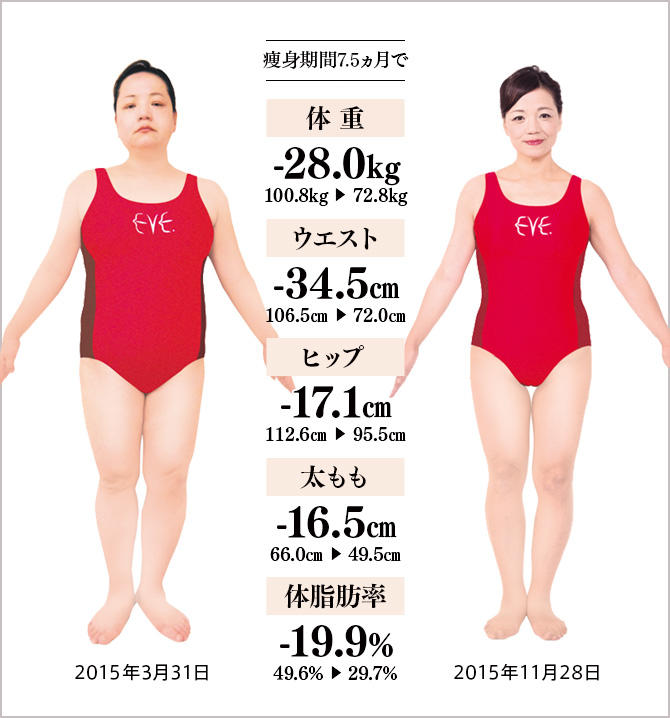 仕事多忙による不規則生活と暴飲暴食で、体重が100kg台に。心臓に負担を感じ、健康を取り戻したいと強く思ったときに、娘から「みっともないから卒業式に来ないで」の言葉…。そんなとき、東洋思想を含めたトータルビューティーが概念のイヴを知りました。温式痩身のイヴに通い、体を温めたことで体調の好転が実感できたため、今では自室の温度も30℃に設定。最初の16回で10kg減後に受けた健康診断では血圧が基準値に下がっていて産業医に褒められ、33回で20kg痩せたときには洋服が5サイズダウン。さらに痩せ、20代の体重になったら、周囲の人から「体が半分になった」「若々しくなった」の声。入学のきっかけとなった娘との外出もぐんと増えました。