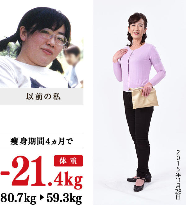 30代半ばからストレスによる過食が原因で太り始め、ドラム缶体型に…。娘に「恥ずかしい」、息子に「細いお母さんを見たい」と何回もいわれ、自己流痩身をしても三日坊主。子どもたちの願いを叶えるためにイヴを訪ね、運動嫌いの私でも無理なく続けられそうだったので入学しました。家では水分のとり過ぎに気をつけながら温かいしょうが紅茶を飲むようになり、イヴオリジナルのブラッシング体操は入浴前の他に、休みの日は朝や暇なときにも実行。悩みを聞いてくださる先生たちと痩身仲間がいることで頑張る意欲がわくイヴで、最初の1ヵ月で6.7kg減、2ヵ月弱で10kg減!さらに痩せたら、息切れ、脚のだるさ、腰痛を感じなくなりました。