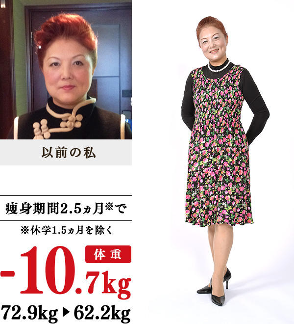 毎年受けている健康診断で医師から「体重が多く、脂肪肝の心配もある」といわれ、ショック…。見た目だけではなく、体も健康にしなければいけないと思い、イヴに通い始めました。すると、通い始めて1ヵ月くらいのときには、一番気になっていたお腹周りが7cmも痩せていたので驚きました。また、40歳頃から冷えを感じていて、汗も出づらいタイプでしたが、温かい教室に通うにつれ、徐々に発汗しやすくなりました。それと共に、体のめぐりまでよくなったようでした。帰省のために思うように通えない時期もありましたが、短期間で10年前の体重に戻れ、嬉しいです。