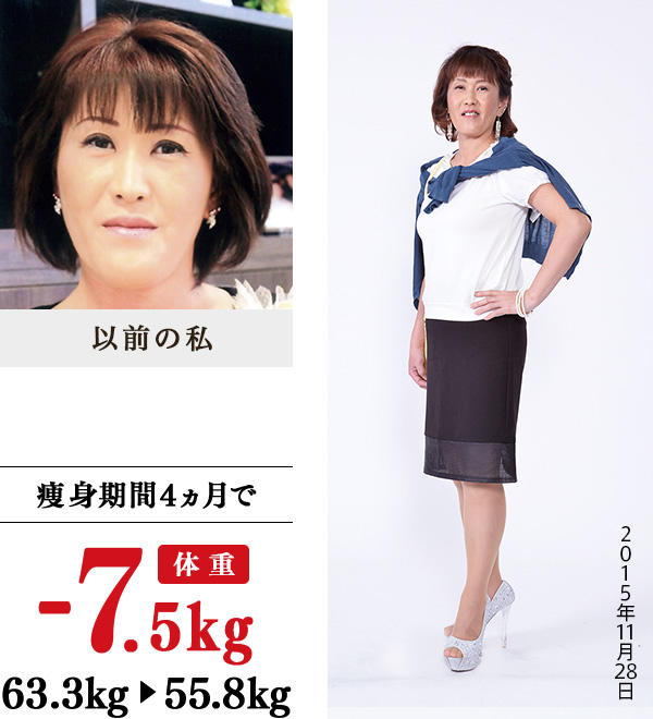 20歳の娘の「ママと買い物に行きたくない。だってデブなんだもん!」の言葉で鏡を見ると、そこには醜い体型…。自己流で6kg痩せたものの、めまい、立ちくらみ、仕事中に3回失神するほどの血圧低下となり、ダイエットに悩んでいたときにイヴを知り、すがる思いで連絡を入れました。先生たちは、明るく、元気にいつも励ましてくださり、温かいトリートメント室でのボディケアはとても気持ちよく、体調も良好に!痩せたら、物ごとを前向きに考えられるようになり、18年間メンタル疾患があったことが嘘のよう。転職し、新天地で楽しく、忙しく働くようにもなりました。周囲の人に「シワもなく、キレイに、細くなった」といわれます。