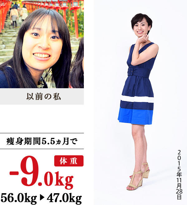 かつてつきあっていた彼氏に、ずっと「痩せたほうがよい」といわれ続け、自己流ダイエットをしたけれども限界を感じたため、イヴへ。オープンスペースの教室は、他の生徒さんとの会話で一緒に笑ったりできるので気持ちが落ち着き、温かい室温は「ここにいるだけで痩せそう!」と感じられ、先生たちの手技はまるで機械のようで、通い続ければ確実に痩せそうだと思ったので入学しました。家ではひじきやわかめでミネラルを補い、しょうがも料理によく使い、ブラッシング体操は半身浴前に行うとともに、寝転びながらブラシを使ったお腹と脚の集中ケアも実行。成人後最軽量になり、周囲の人に「顔がより小さくなった」といわれています。
