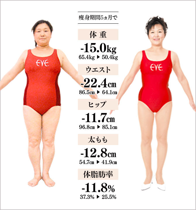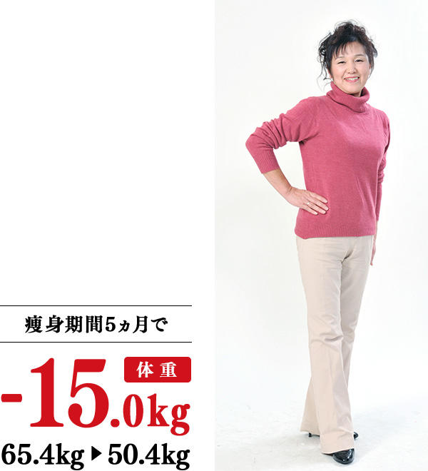 4人目出産後の34歳頃から太り始め、自分で痩身に取り組むも、リバウンドの連続。家族に「トド」と言われたことも…。何をやってもやせなくなったときに、イヴの広告を見つけ、最後のトライと思い、入学しました。教室へ行けば、必ずやせられると実感。家では、食事は魚や野菜中心に3食食べる、最低6時間くらいの睡眠をとるなどのアドバイスも実行しました。やせたら、頭痛がなくなり、毎日、ゼイゼイ、ハアハア、息切れしながら昇っていた会社の階段がヘッチャラに。肌のくすみがなくなり、化粧のノリもよくなったので、今は薄化粧でOKです。旅行に行くのもより楽しくなりました。この先、水泳もマスターしたいです。