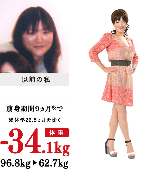 子どもの頃から太っていた私が34kgもの大幅減量することができました。「今さら私が...」と諦めずイヴに通い、一緒に汗を流してトリートメントしてくださる先生たちに励まされ、自分も努力することで、意識が変わります。また、魚や肉を少量でもとると、野菜中心の食生活でも満足できるようになるほど!食事指導も痩身成功には欠かせないものでした。先生たちのサポートのもと努力すれば、必ず結果が出て自分を好きになれます。他界した父と目が見えない母に今の私の姿を見せることはできませんが、母と自分を大切に、前向きにこれからの日々を過ごします。