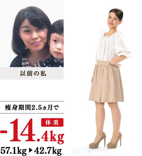 子ども3人を産むたびに体重が増加。他人に、「脚が大根のよう」といわれたことも…。普段、「プヨ肉」と冗談半分に私をからかっていた主人の、「このまま太ったおばあちゃんになるのか?一度も痩せたママを見られないのかな?」という、言葉が心に刺さり、イヴを訪ねました。テレビや本で情報を得て、痩身に関して理解しているつもりでしたが、先生たちの知識は私の知識量をはるかに越え、根拠もはっきりしていて、ここなら痩せられる!と実感。8回で5kg減、23回で10kg減と、行けば必ず結果が出たことにも驚いています。温かい教室に通っているうちに汗がよく出るようにも。寒い日に感じていた薬を飲むほどだった頭痛も、今では感じなくなりました。短期間で出産前の体重に戻り、外出するのも楽しい毎日です。