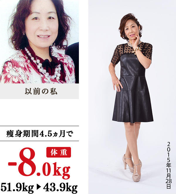 22時過ぎからの飲食が原因で体重が増加…。娘がイヴを見つけ、私も体験に行きました。オープンスペースの温かいトリートメント室は明るい雰囲気。そこで充実の痩身器具と美しいボディラインをつくるための高い技術をもつ先生たちにケアしていただき、イヴオリジナルのブラッシング体操も行うことで心身ともに健康になれることを実感。食事指導は自分自身の生活を見直すよい機会となり、卵、高野豆腐、納豆などを取り入れた低カロリー高タンパク質の食事と、しょうが入りごぼう茶や温かい飲み物を中心に、コーヒーや食後の飲み物は減らすなどを心がけました。娘も8.5kgも痩せて、生活を改善すれば痩せることをお互いに実感できました。