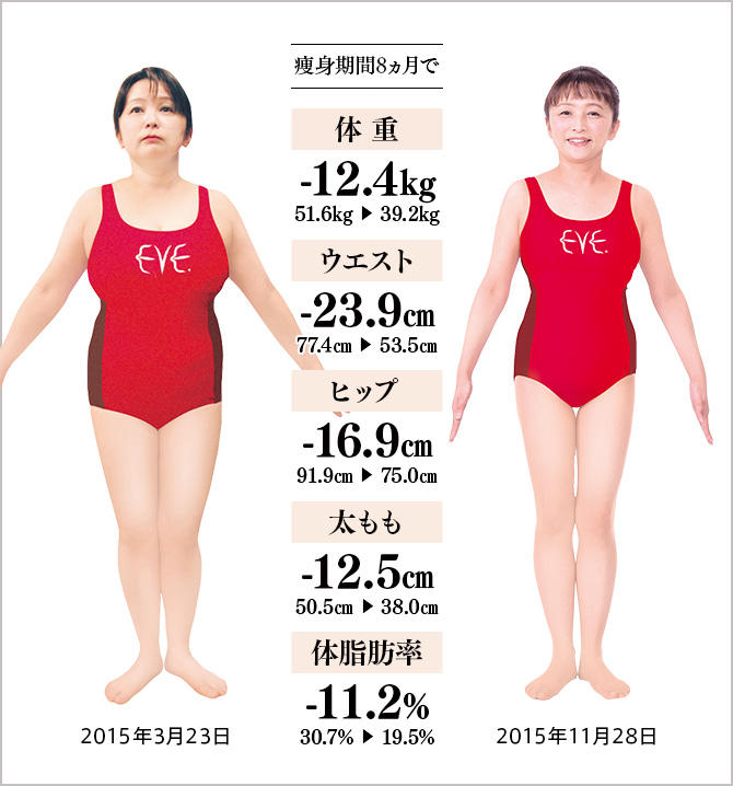 長い間、偏頭痛と肩こりによるひどい頭痛に悩まされ、家事ができない日も多々…。ウォーキングをするとすぐに膝が痛くなり続けられませんでした。そんなある日、主人がイヴの折り込みチラシを持ってきて、「健康になることが一番。行ってみたら?」と背中を押され体験へ。最初はトリートメント室の暑さが苦手でしたが、通っているうちに慣れ、自力ではここまで痩せることはできなかったと思える減量数を達成!昔から知っている人に「初めまして」といわれたり、痩せてから会った人に昔の画像を見せたら「衝撃的」と驚かれるくらい別人に変身したようです。痩せただけではなく、頭痛の回数も激減し、薬や通院が不要になったことが一番嬉しいことです。