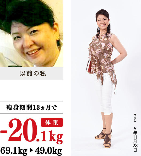 閉経後ガンガン太って人生最大体重になり、洋服がすべて入らなくなりました。仕事中は体がキツく、痛みも発生…。診療室でドクターが患者指導をしていても、ドデカイ私が後ろにいたのでは説得力にかけるうえ、仕事で信頼されている人は皆痩せていたので、イヴに入学しました。最初はトリートメント室の暑さが苦手でしたが、結果が出たことと、私のマイナス発言にもプラス思考で支援&応援してくれた先生たちがいたので頑張れ、40kg台に!血圧、血糖、脂質の数値が下がり、走ったり、階段の上り降りもスムーズになりました。周囲の人からは「別人」の声。先生たちのケア方法や接客から仕事面でも学ぶことが多く、職場で試したら好評でした。
