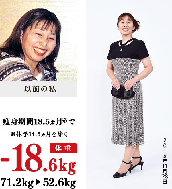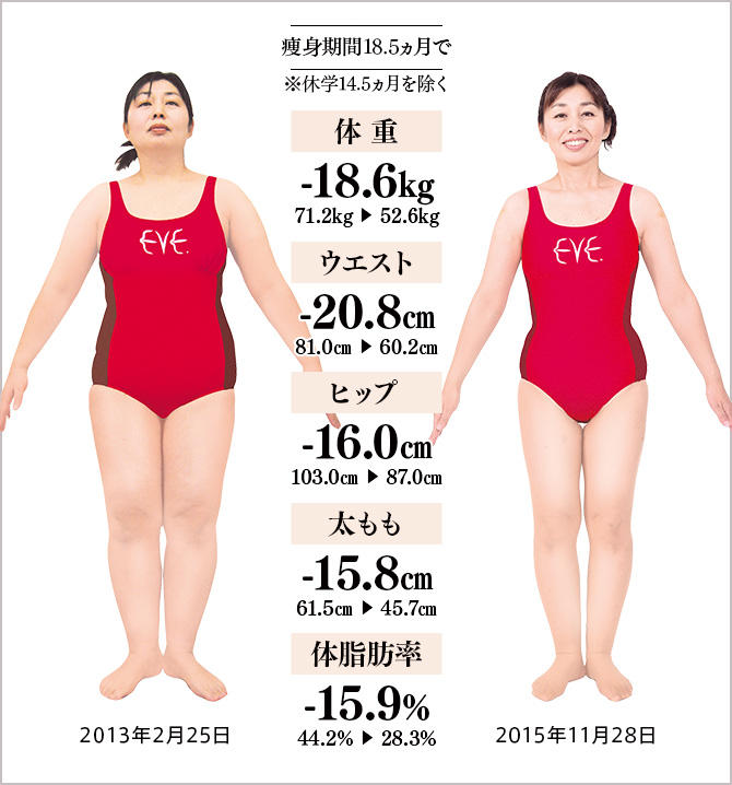 中学時代の恩師の退職祝いの際に、同窓生と一緒に撮った写真の自分の姿を見てビックリ!痩せなくてはという危機感を感じ、食事に気をつけたり、体を動かしましたが、人生最大となった体重は何をしても落ちませんでした。そんなときにイヴを知り、体験へ。温かいトリートメント室で汗をかくと気持ちよくなり、痩身技術を受けているときは痛みを感じることもありますが、終了後や翌日はスッキリ!家ではキノコ、海藻、野菜、しょうがを使った温かい料理を積極的に食べ、ブラッシング体操も実行。26歳頃の体重に戻ったら、楽に動けるようになりました。周囲の人から、「小顔になった」「目が大きくなった」といわれちゃいました。