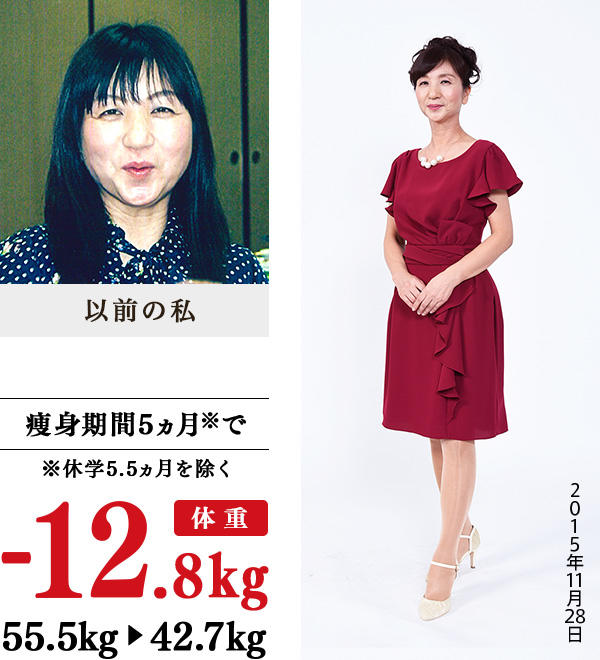 毎年受けている人間ドックで、いつも体脂率が30%以上。ウォーキングや運動をしても体脂肪率も体重も減らず、悩んでいました。そんなときに出会ったイヴは、先生たちとともに他の生徒さんもいるオープンスペース。安心して体を任せられると思いました。いつも汗をかきやすい状態の温かい空間でボディケアしていただいたら、体のラインもキレイに!8kg減で山登りへ行ったときは、体が軽くなったことで楽しく歩け、10kg痩せた頃から、「脚がキレイ」「小顔」とよくいわれるようになりました。イヴに通い、家で先生たちから学んだ体を冷やさない食事や生活習慣に気をつければ、絶対痩せられます!これからも今の体型を維持していきたいです。