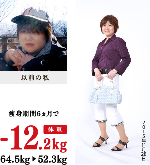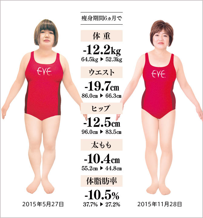 友だちがスポーツジムで10kgくらい痩せたのを見て、「私にもできるのでは?」と思い、別の友人とともにイヴの体験へ。痩身成果が出ている人が多かったことが決め手となり、入学しました。先生たちは親切で、一所懸命サポートしてくださり、トリートメントもGOOD!家では1日の食事量バランスを朝3:昼3:夜4から、朝4:昼4:夜2に変え、入浴は食事後にしてカロリーを消費するようにという指導を実行しました。今まで周囲の人に痩せられない体質だといわれ、半ば諦めていた私が、12kg以上の減量に成功し、10代半ばの体重に!ジーパンも余裕で入る細い脚も手にできました。