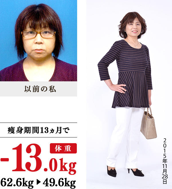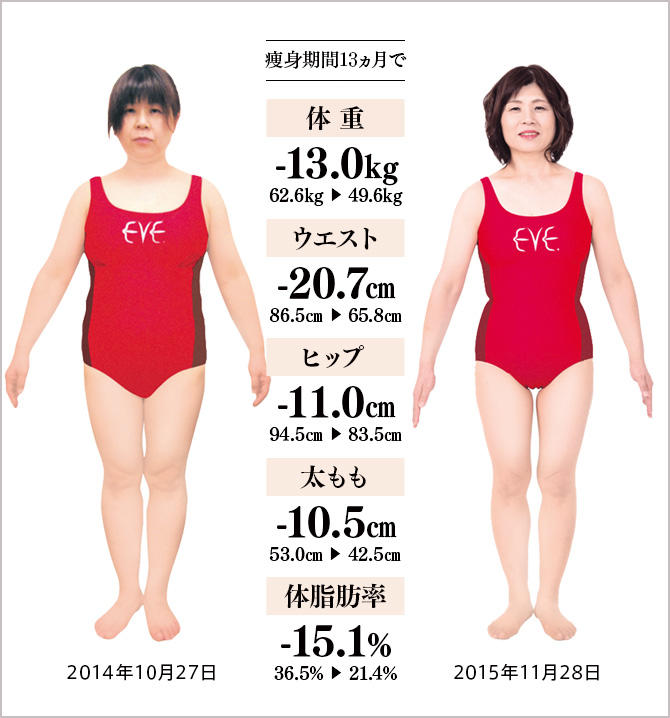 健康診断で「メタボだから痩せなさい」といわれたあと、自分なりに努力はしていたもののなかなか体重が落ちず、悩んだ末にイヴを訪ねました。トリートメント室の高めの室温は、私にとっては心地よい温かさ。いつも元気な先生たちに丁寧に、しっかりと手技をしていただくと、とても気持ちよくなり、リラックスできました。家では、豆腐以外の白い食品は朝か昼に食べ、食事の量や時間も指導を守りました。体重が落ちる日も、なかなか落ちない日もありましたが、5kg痩せたときにメタボ腹囲から脱出でき、10kg減でブーツが履ける脚に!いまは、20代の頃の念願の40kg台になりました。