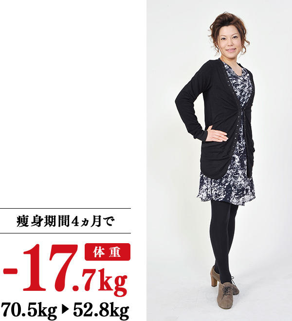 30代に入ってから太り始め、33歳で人生最高の85kgに。いろいろな痩身法で2〜3kgやせてもリバウンドの繰り返しでした。あげくの果てに、元夫に「魅力がなくなった」と言われ、34歳で離婚…。今回は、気になる男性が現われ、アプローチできるように、きれいになりたいと思い、イヴに入学しました。施術のスゴイ効果に驚きながら、通学6回で5kg減、2ヵ月で10kg減! やせたら、風邪をひかなくなり、顔の吹き出物も減りました。家族、友人、職場の人、元夫、そして気になる人からも「やせてきれいになった」と言われ、嬉しいです。どん底だった私に、希望と自信が見えてきて、前向きで明るくなれました。