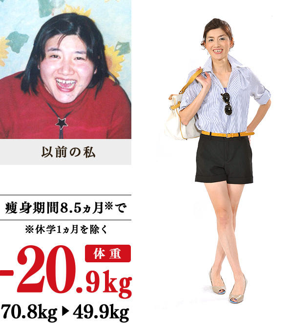 その日の私の体調や状況に応じて考えていただける痩身メニューで、ウエストからお腹まわりがスッキリし、脚はまっすぐになり、全身バランスよく痩せることができました。洋服は、体のラインを隠すデザインから、逆にラインを強調するものに激変。まわりの人に「美脚」「小顔」といわれるようになったのも嬉しいです。イヴの先生たちの数々のアドバイスは私の宝物。目標をもって頑張れば、必ず結果が出せる痩身法だと思いました。
