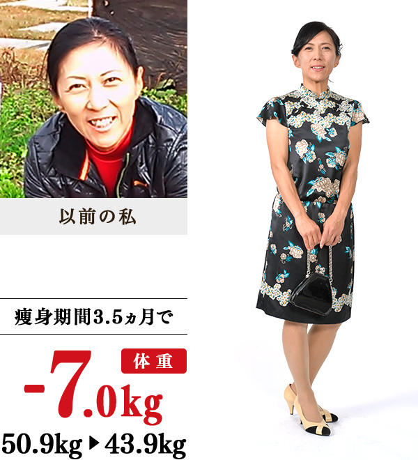 長年勤めた会社を退職し、自分を見つめ直す時間ができたので、今まで見て見ぬ振りをしてきた体のラインを改善したいと思うようになりました。50歳を目前に、何をすればいいのかと思い悩んでいたときに、イヴの「健康やせ」の文字を見つけました。最初の体験時に、開放感のあるオープンスペースの教室に入ったとき、痩身といえば個室という固定観念が覆され意外性を感じましたが、実はこのオープンスペースこそが痩身情報の交換の場なのだと後々理解しました。温かい教室に定期的に通うことで発汗がしやすくなり、それに伴い体重もダウン。家では、温野菜やもともと好きだったきのこ類をより積極的に食べるよう心がけ、半身浴とイヴオリジナルのブラッシング体操を実行。細部にまで気を配り、親身になってくださる先生方のサポートもあり、短期間で高校卒業時の体重に戻ることができました。