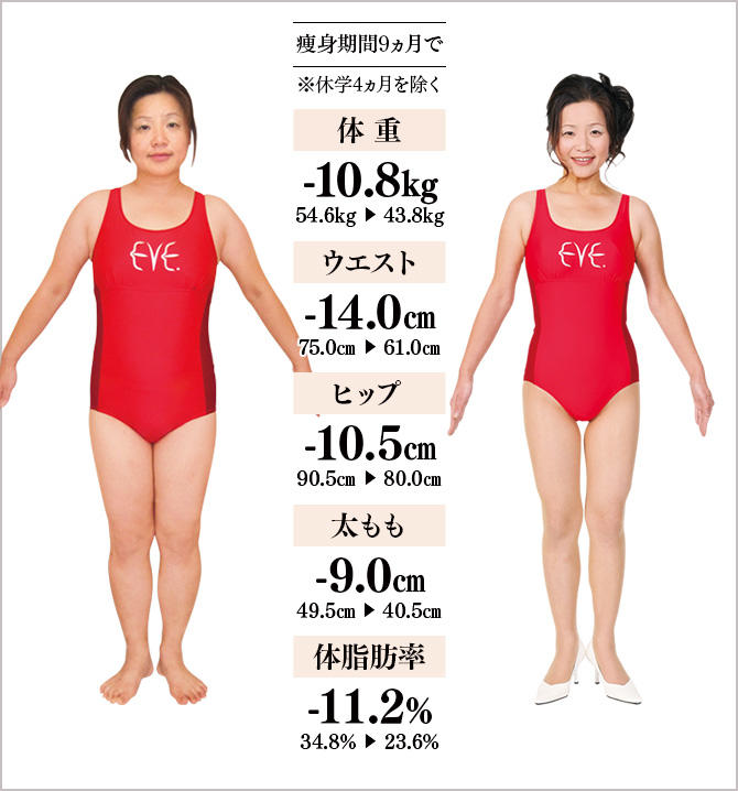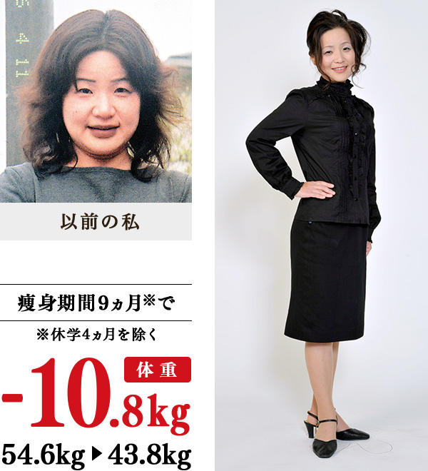 幼少期から肥満。学生時代から痩せてはリバウンドを20数年繰り返してきたら、慢性疲労にも…。子どもに、「痩せているお母さんを見たい」といわれ入学したイヴには、素晴らしい健康やせメニューがたくさんありました。高い技術力と親身なサポートで、私にあったプログラムを行っていただき、効果を実感!ウエストにはくびれができ、太ももにはすき間もできました。痩せたら、体を動かすことが楽になり、機敏に行動ができるようになりました。もうすぐ7号の洋服も着られます。化粧品にも興味が出てきたので、これからは積極的にお洒落を楽しみたいと思っています。