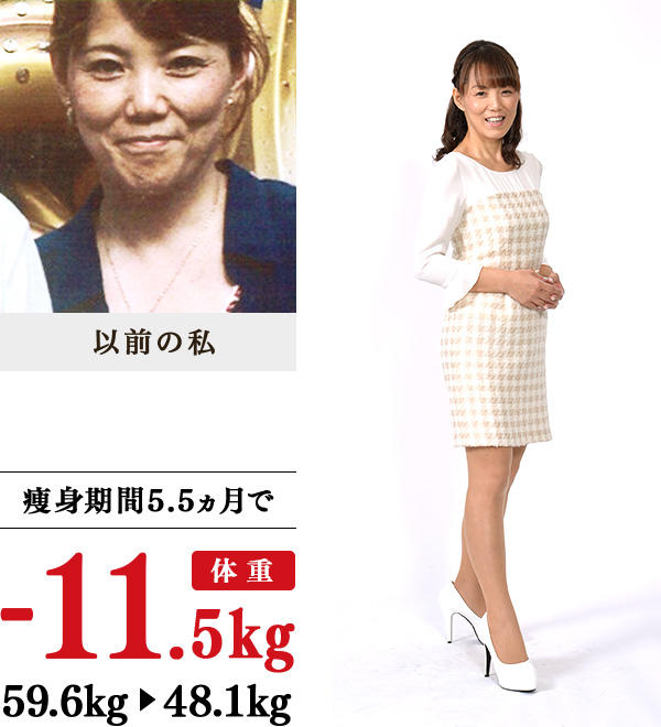 思春期から下半身太りに…。その後、加齢とともに、代謝が下がり、食べた分だけ太るどころか、食べなくても痩せない体になってしまいました。ダイエット食品や健康器具を試したり、ジムで水泳をしても長続きせず、成果も出ず…。そんなときにイヴの広告を見つけました。先生たちの対応はとても丁寧。その日の私の体調を見て、メニューを考えていただくことも嬉しく、最初の1ヵ月で5.3kg減達成! 下半身が冷たく、寝つきが悪かったのですが、イヴで体を温め、家ではしょうが入りの白湯や紅茶を毎日飲むようになったら、湯船に入るとすぐに汗が出て、夜も眠れるように。「脚が細くなった」と褒めてくれた娘もイヴに入学。旦那さんは「昔のキレイな頃に戻った」といってくれました。また、体力がついたのか、風邪も引きにくくなりました。