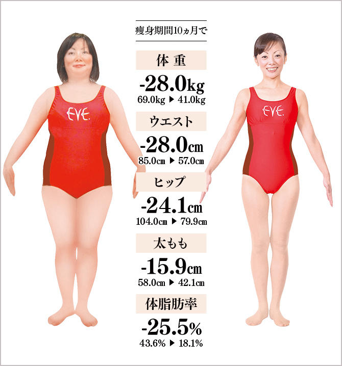 25kg痩せたあとに受けた健康診断の結果は「異常なし」。健康的に痩せたら、仕事がはかどり、外に出かけるのも楽しい日々。愛する息子も喜んでくれています。洋服は、15号のゆるめの長い丈のトップスやレギンスから、9号のお尻を隠さないトップスや細身のデニム、スカートなどに激変。昔の自分を取り戻しました。長年の肥満人生を変えてくれたイヴ。もっと早く出会いたかったです。