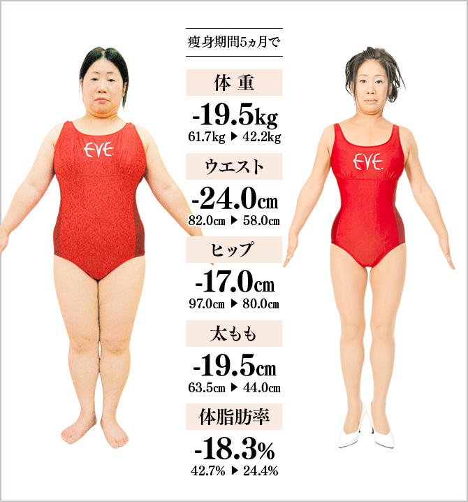 健康診断で少しずつ血圧の数値が高くなり、体調も悪化…。息子の、「やせなきゃ水着を着ちゃダメ!」の言葉にもショックを受け、健康やせのイヴに入学しました。教室では、毎回、目に見える減量結果が励みになり、家では、海藻類、きのこ類、体を冷やさないように鍋やスープ、温かい飲み物をとるなどのアドバイスを実行。やせたら、最高血圧が140から120の理想値に下がり、肌は白くなり、気になっていた肩の湿疹ができなくなりました。今年は、息子と一緒に大好きな海へ行き、太ったことでやめていたボディボードも再開します。