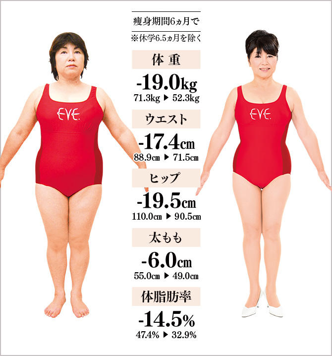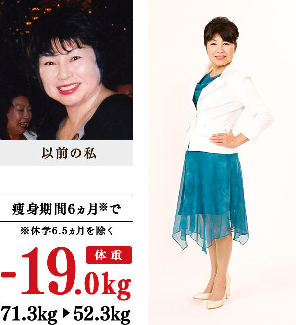 水を飲むと痩せると聞き、毎日、水を1〜2ℓ飲んでいたら、逆に更年期以降、太ってしまいました。太ももがすれて、ストッキングがすぐ破れてしまうことも…。そんなとき、会うたびにキレイになっていく友人がイヴに通っていたことを知り、私も入学しました。教室では、先生方のいつも親切で一生懸命のケアに感謝しながら、19kgの減量に成功!体のラインが出る洋服を着るようになり、太ももが細くなったので、ストッキングが破れることもなくなりました。友人に、「キレイになって、顔も小さくなった」といわれ、その仲間たちもイヴに入会。仕事上でお会いする、男性のお客様にとても優しく接していただけるようになりました。