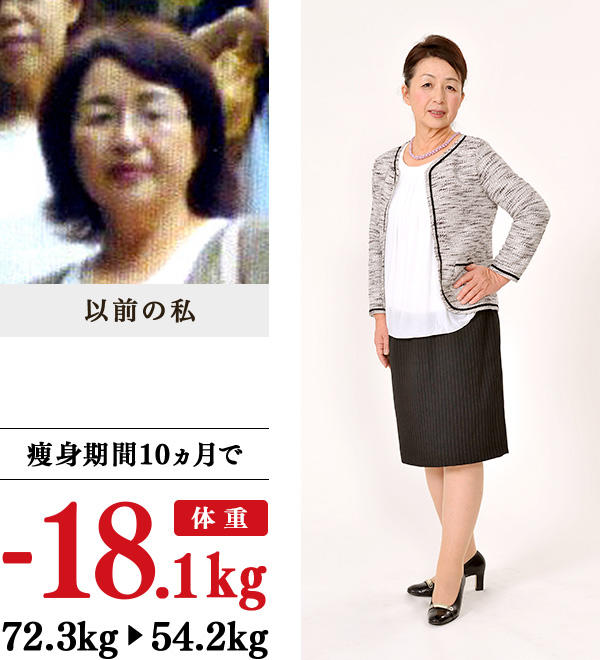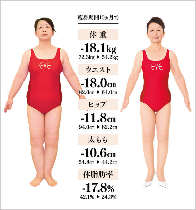 趣味はダイエット、特技は三日坊主という私ですが、太っていても健康ならかまわないと思っていました。2年前くらいからさまざまな不調があらわれ、健康面で不安も感じたので、イヴへ行くように。教室では、どんな手をしているのだろうと思うほどのすごい手技を受け、毎回、体が軽く。5kg、10kgと減っていくと、人からも、「痩せたね」といわれ、通うことが楽しくてしょうがなくなり、最終的に18.1kgの減量に成功! 洋服のサイズは、13号から9号に変化。子どもの頃から太かった脚も細くなり感激!健康やせを実感しています。