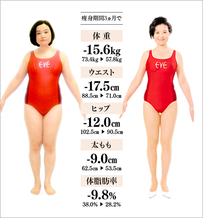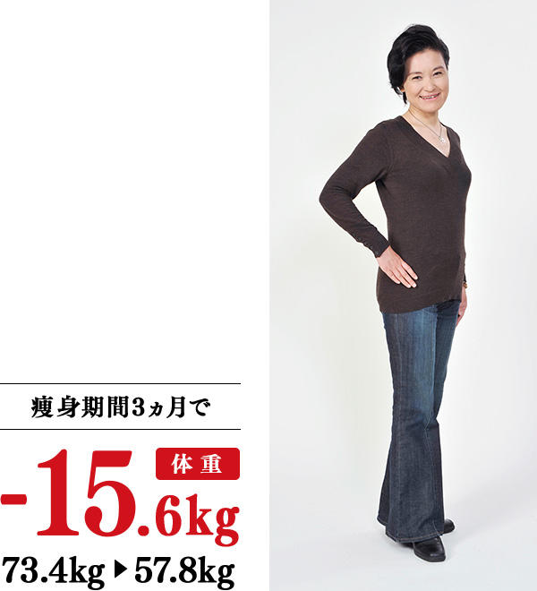 主人と結婚後、甘い生活の中、油断して65kgに。その後、2009年末に大好きな母が他界し、ショックで過食になり、83kgに…。母の埋骨式で礼服が着られず、母に申し訳なく思い、痩身を決意しました。イヴでは、たった3ヵ月で結婚当初の体重58kgになれ、主人がご褒美にバッグを買ってくれました。健康診断で肝臓の数値が悪かったのですが、やせたあとの数値はすべて理想値で、体脂肪率は10年ぶりに25%以下に。毎年楽しみにしている、映画「ロッキーホラーショー」の出演者になり切ってパフォーマンスをするときのコスチューム姿も、数段きれいになりました。