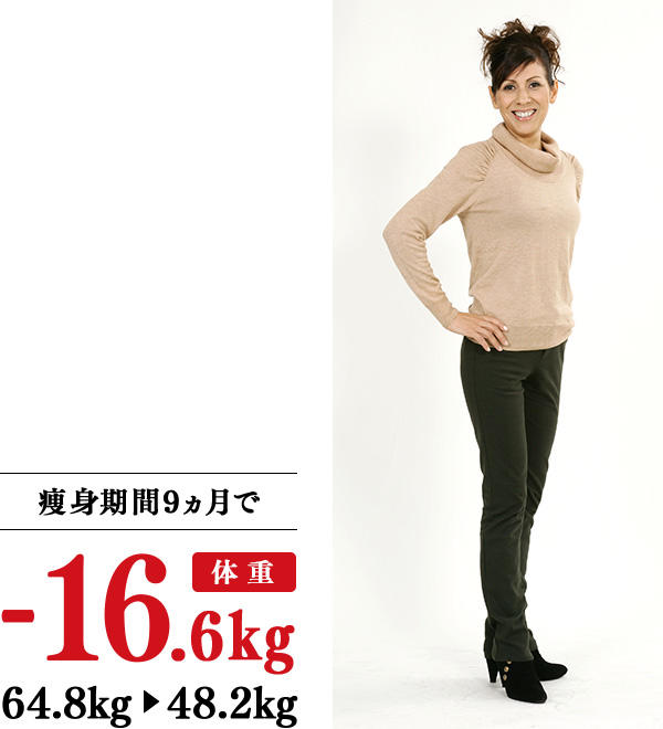 結婚し、1人目を出産したときの体重は52kg。日本に来て、2人目出産後、冷え性や便秘になり、最高72kgに…。痩身にトライしましたが、体調を崩し長続きせず、病院に行ったら、貧血といわれました。イヴの発汗系の施術は、暑いのですが、先生方が親切に声かけをしてくださるので続けられ、私と相性がよいことにも気づきました。家では、食事を野菜中心に変えたり、小麦食品を控えたり、また、ブラッシング体操や半身浴も実行し、減量に成功!やせたら、周りの人たちから、「きれいになった」「若返った」と言われるようになりました。貧血が生じなくなったり、エアロビクスをしているときに、息が続くようになったのも嬉しいです。